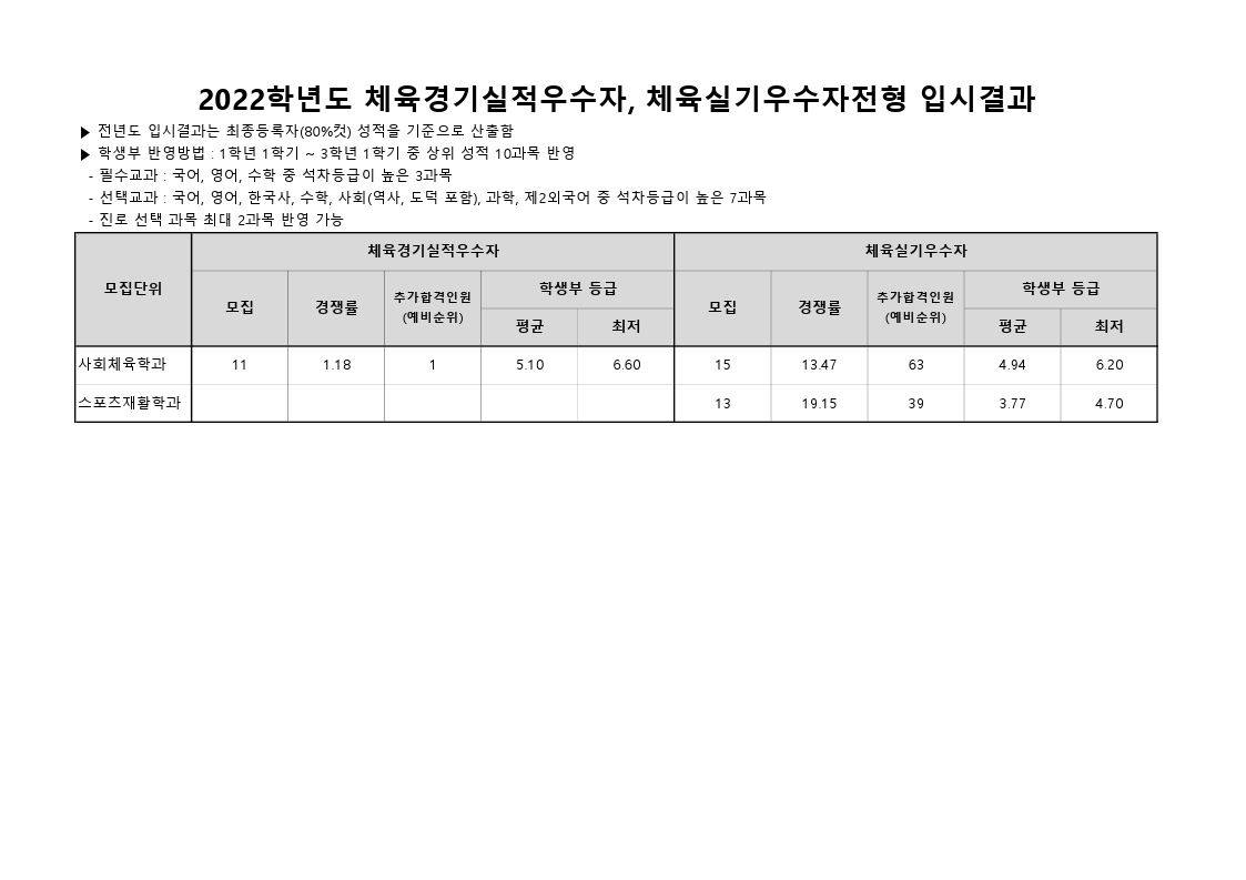 전년도 입시결과 수시 2022학년도 - 체육경기실적우수자, 체육실기우수자전형 첨부파일전년도 입시결과 체육실기_실적80.pdf(38.4K) 2022학년도 - 체육경기실적우수자, 체육실기우수자전형 2022. 4. 7조회수5,993 2022학년도 - 특성화고교과, …목록2022학년도 - 정원외(농어촌_…