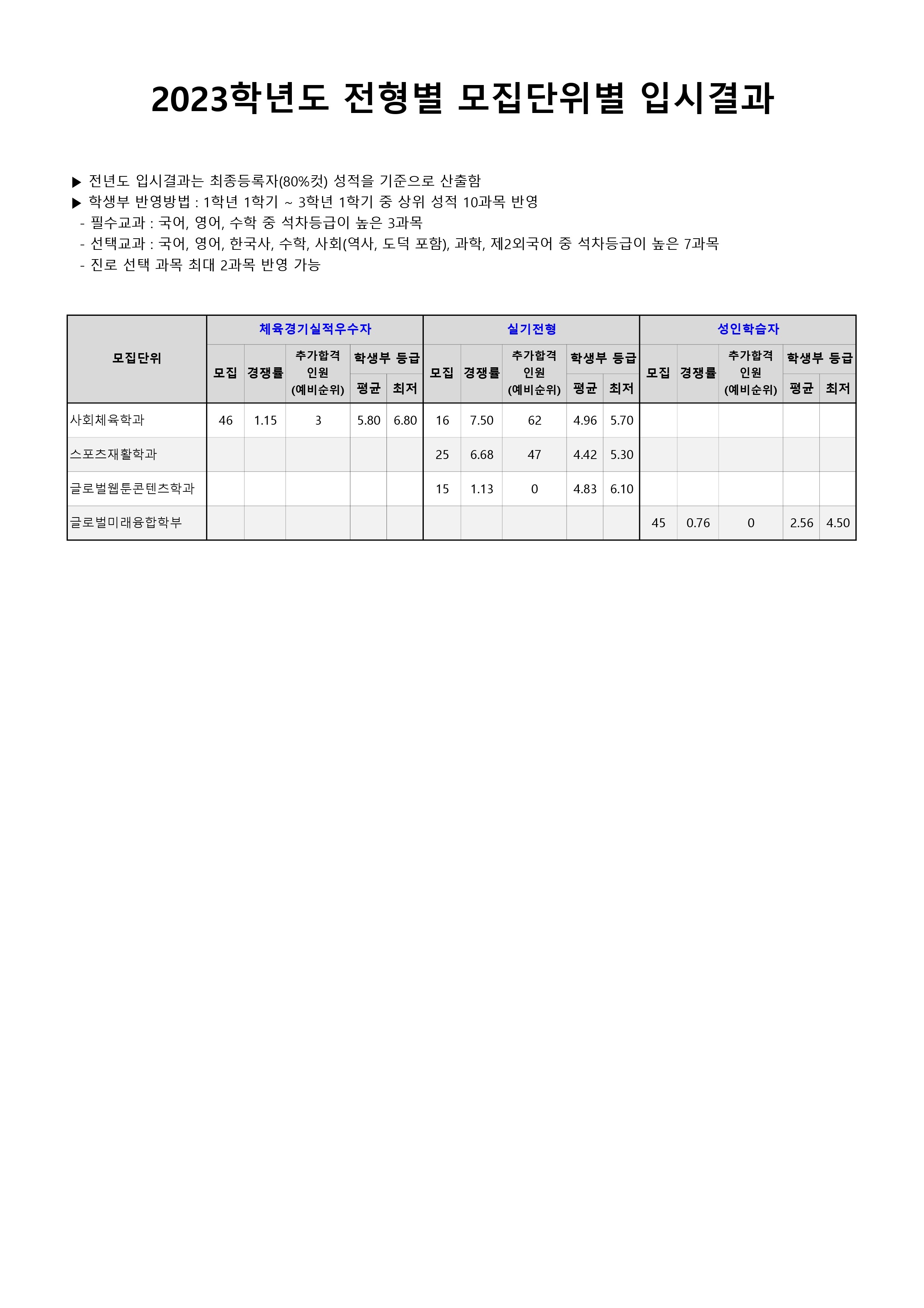 전년도 입시결과 수시 2023학년도 - 체육경기실적우수자, 실기전형, 성인학습자전형 첨부파일3. 2023학년도 입시결과 체육경기실적우수자_실기전형_성인학습자80.p…(344.1K) 2023학년도 - 체육경기실적우수자, 실기전형, 성인학습자전형 2023. 3. 28조회수5,172 2023학년도 - 특성화고교과, …목록2023학년도 - 정원외(농어촌,…