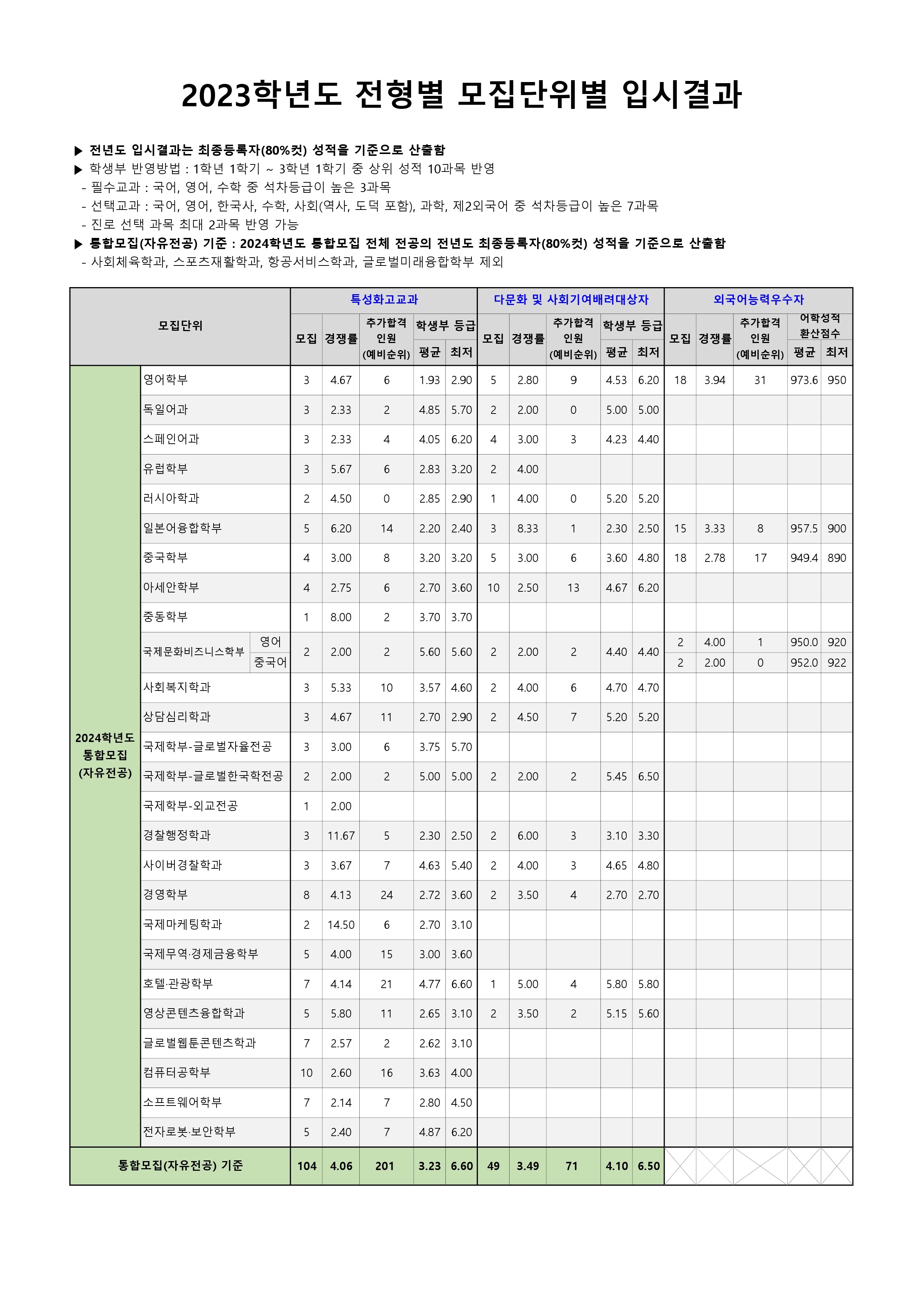 전년도 입시결과 수시 2023학년도 - 특성화고교과, 다문화 및 사회기여배려대상자, 외국어능력우수자전형 첨부파일2023학년도 입시결과 특성화_사배자_어학80.pdf(59.4K) 2023학년도 - 특성화고교과, 다문화 및 사회기여배려대상자, 외국어능력우수자전형 2023. 3. 28조회수8,694 2023학년도 - 일반고교과, 교…목록2023학년도 - 체육경기실적우수…