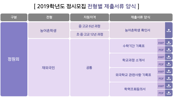 입시자료 정시 [2019학년도] 정시모집 전형별 제출서류 양식 첨부파일2. 농어촌학생 확인서.hwp(48.0K)3. 수학기간기록표.hwp(22.0K)3. 수학기간기록표.pdf(46.4K)4. 학교과정소개서.hwp(14.5K)4. 학교과정소개서.pdf(30.0K)5. 외국학교 관련사항 기록표.hwp(17.0K)5. 외국학교 관련사항 기록표.pdf(32.5K)6. 학력조회동의서.hwp(15.5K)6. 학력조회동의서.pdf(60.7K) 2018. 12. 18조회수9,162 [2019학년도] 특성화동일계 기…목록[2019학년도] 수능최저학력기준