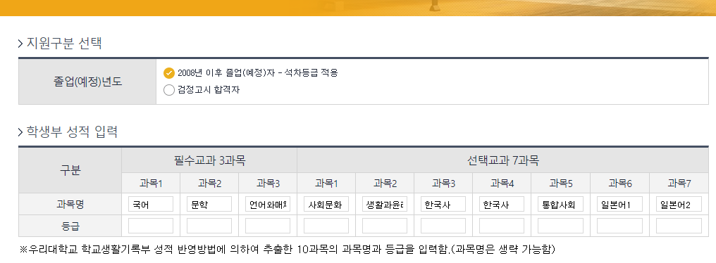 단, 2012년 2월 이전 졸업자(2012년 2월 졸업자 포함)는 고교 학교생활기록부 사본 1부(학교장 직인 날인)를 제출해야하며,