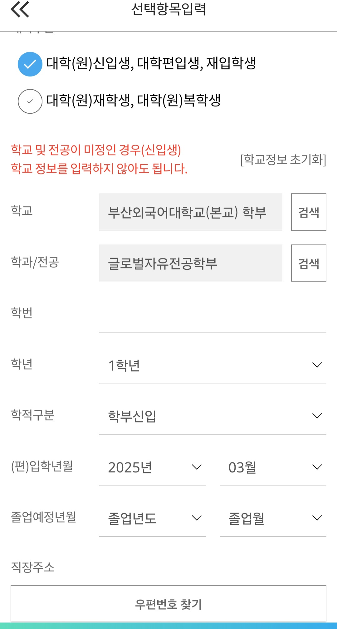 신입생 정보는 어떻게 입력해야하나요? 학교,학과,학년,학적구분만 입력하니 학번을 꼭 쓰라고 하던데요.. ㅠㅠ